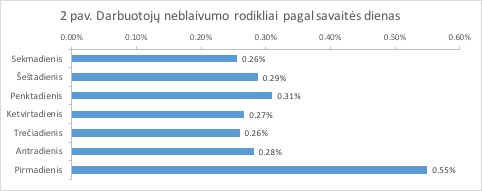 Maždaug trečdalis alkoholį vartojančių asmenų jį vartoja žalingai, t.y. iki prisigėrimo. Šią problemą dar kartą patvirtina ir blaivumo patikros rezultatai. Analizė parodė, kad neblaivūs darbuotojai į darbą dažniausia ateina pirmadieniais (žiūrėti 2 pav.).